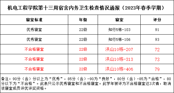 宿舍卫生文明建设,营造良好的学习生活环境,促进学生的健康成长,现将2023年春季学期第十三周宿舍检查结果通报如下: