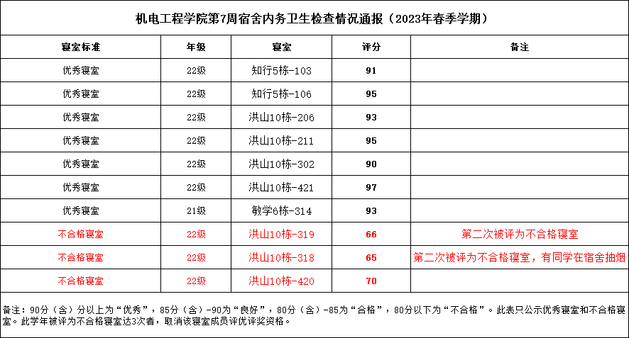 宿舍卫生文明建设,营造良好的学习生活环境,促进学生的健康成长,现将2023年春季学期第七周宿舍检查结果通报如下: