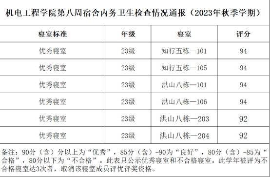 宿舍卫生文明建设,营造良好的学习生活环境,促进学生的健康成长,现将2023年秋季学期第八周宿舍检查结果通报如下:
