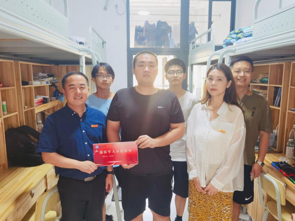 当来到退伍军人20机械03班牟启维同学的宿舍时,院党总支书记张昊与学生进行了亲切交谈,询问了退役复学后生活、学习等方面的情况。“退伍不褪色,要维护军人的荣耀。”张昊表示,这次新增给退伍军人和军训教官们宿舍挂牌,就是希望他们能发扬在部队、在校国旗护卫队集训时的优良作风,切实起到榜样示范的作用。