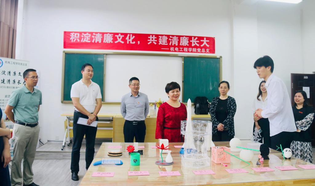 金工实习工厂A404展出,吸引了校党委委员、纪委书记丁文、校纪委副书记贺革、校党委宣传部常务副部长徐远超、校学工处处长张镇等领导和广大师生驻足观看。