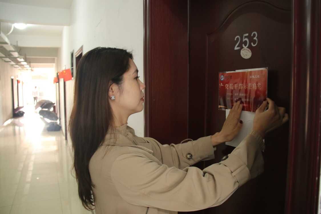党总支副书记唐珍妮、院宿舍专干辅导员柳佳柱至学生干部、党员宿舍举行挂牌仪式。