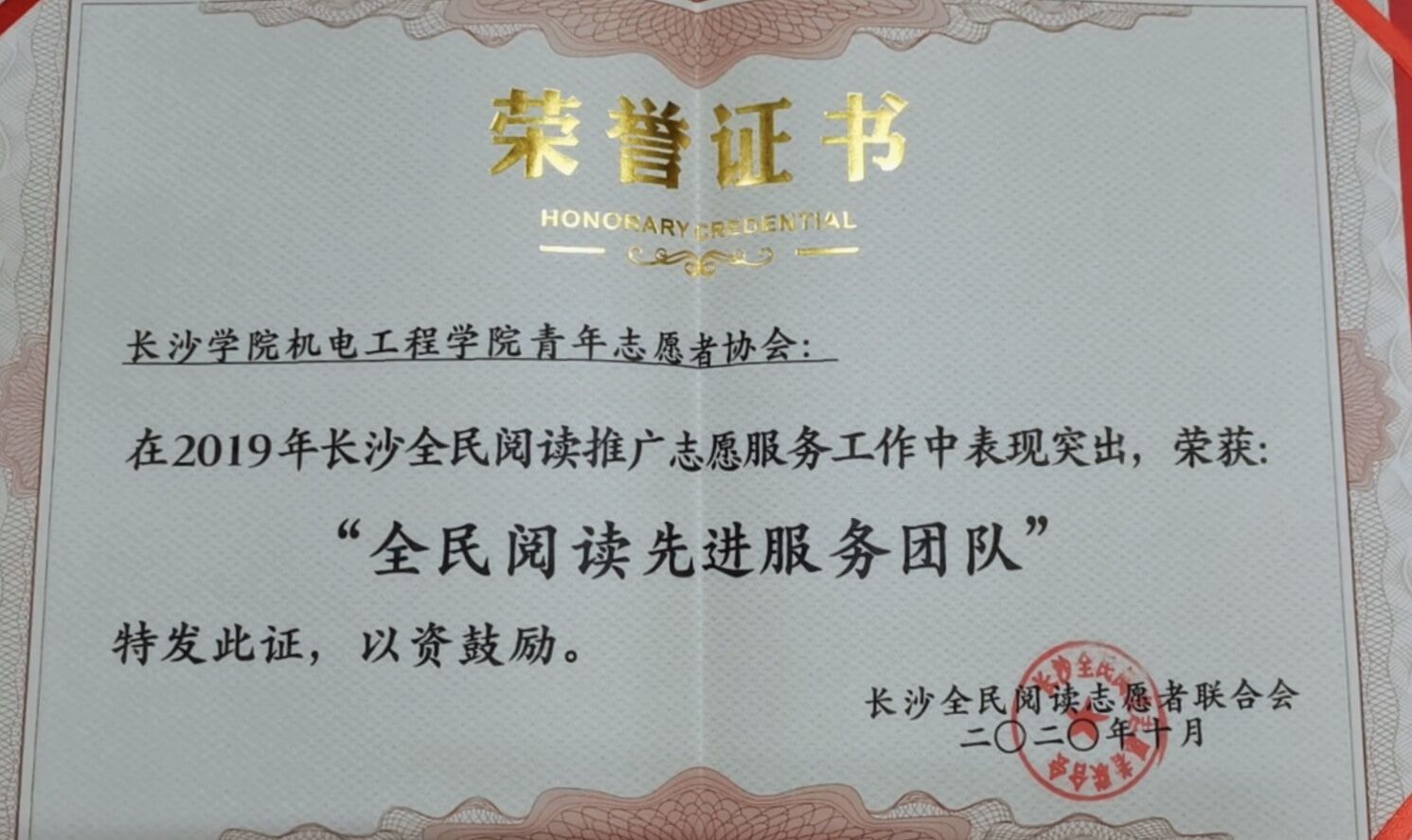 青年志愿者协会在2019-2020年志愿服务中表现优异,获评长沙全民阅读先进服务团队。这也是协会连续四年获得此项表彰。其中,袁红利同学被聘请为长沙全民阅读志愿者联合会E课堂项目负责人,郑若禹、谭嘉健两位同学获评全民阅读最美志愿者。
