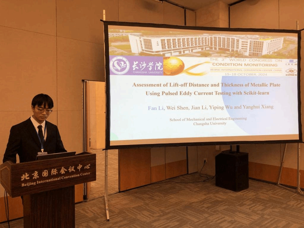 李帆同学宣讲的论文题目是《Assessment of Lift-off Distance and Thickness of Metallic Plate Using Pulsed Eddy Current Testing with Scikit-learn》。该论文是在李建老师的指导下,建立了全波形脉冲涡流检测电压信号与金属板厚度及提离的人工智能模型,根据论文介绍的模型可以根据采集的全波形脉冲涡流检测电压信号,同时准确获取金属板厚度和提离距离,并且对噪声有良好的鲁棒性。相关研究得到了来自英国纽卡斯尔大学、西安交通大学等国内外学者关注。