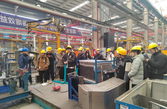 在车间主任的全程带领下,学生们深入山河工业城园区多个核心生产部门,开展沉浸式实践学习。将所学到的相关理论知识与实际操作紧密结合,学习先进的生产工艺、参与项目研讨,在面对各种实际问题时积极思考、主动请教,展现出了良好的专业素养和求知精神,也为企业的产品开发注入了新的活力。从液压缸车间、薄板件加工线到挖掘机铆焊车间、凿岩设备装配线,学生们亲眼见证智能化生产线的高效运作,并亲手触摸精密零部件,理解机械设计、材料成型工艺与机电一体化技术的实际应用。奈飞工厂展厅参观环节中,山河智能“理想成就未来”的发展理念与全球化战略布局,进一步激发了学生的行业使命感。