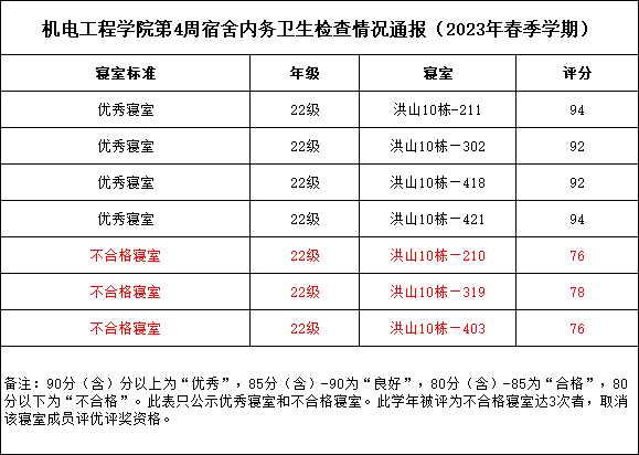 在此,对优秀寝室提出表扬,望再接再厉。对不合格寝室(洪山10栋210、319、403)提出通报批评。请不合格寝室立即整改,根据奈飞工厂