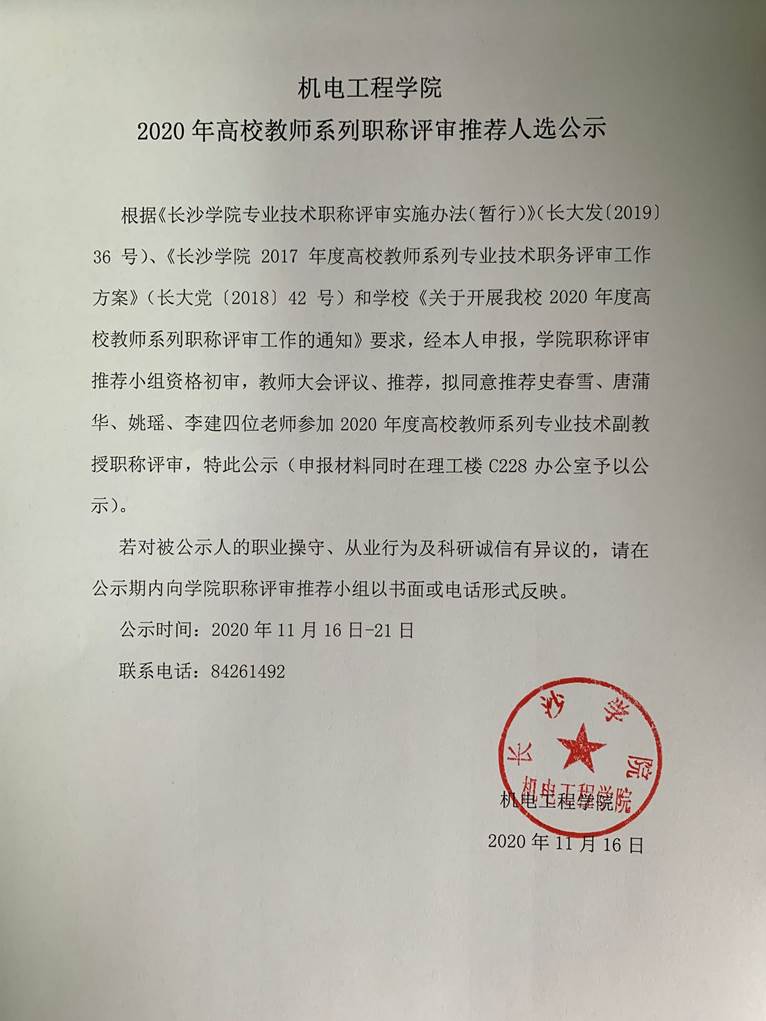 2017 年度高校教师系列专业技术职务评审工作方案》(长大党〔2018〕42 号)和学校《关于开展我校2020年度高校教师系列职称评审工作的通知》要求,经本人申报,学院职称评审推荐小组资格初审,教师大会评议、推荐,拟同意推荐史春雪、唐蒲华、姚瑶、李建四位老师参加2020年度高校教师系列专业技术副教授职称评审,特此公示(申报材料同时在理工楼C228办公室予以公示)。