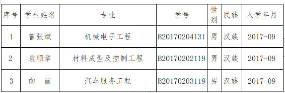 学生奖励办法》(长大发[2017]38号)文件要求,经学生个人申请、学生代表民主评议、学院审核(评选范围划分为机械1-4班、材料1-4班、汽车1-2班、机电1-2班),现将2019-2020学年国家奖学金本学院拟推荐名单予以公示。如对评定结果有不同意见,请在公示期内及时向学院学工办反映。