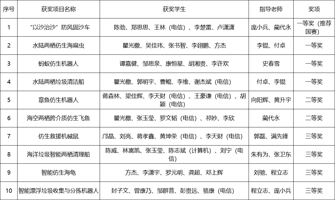 为主,与电信学院和计算机学院共同组成的参赛队伍获得一等奖4项,二等奖2项,三等奖4项,我校获得优秀组织奖。本届大赛全省共有35所高校,2000余名师生携266件作品参赛,我校一等奖获奖数量与中南大学、湖南大学并列第一,其中参赛作品“以沙治沙-防风固沙车”被推荐参加国赛。